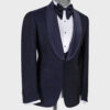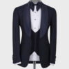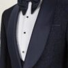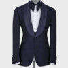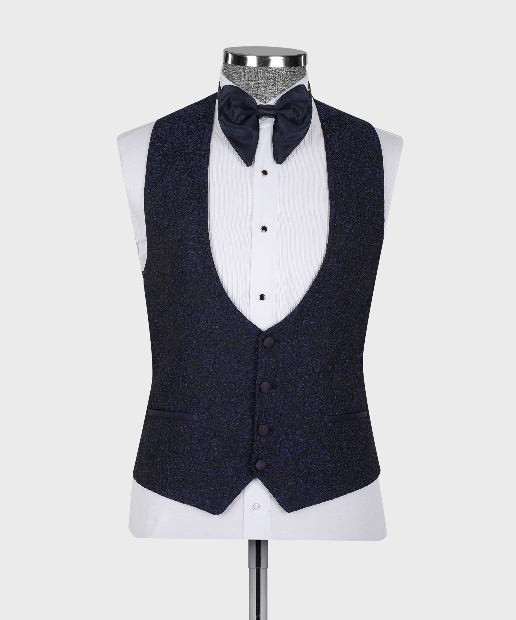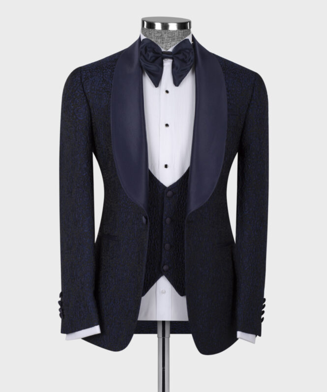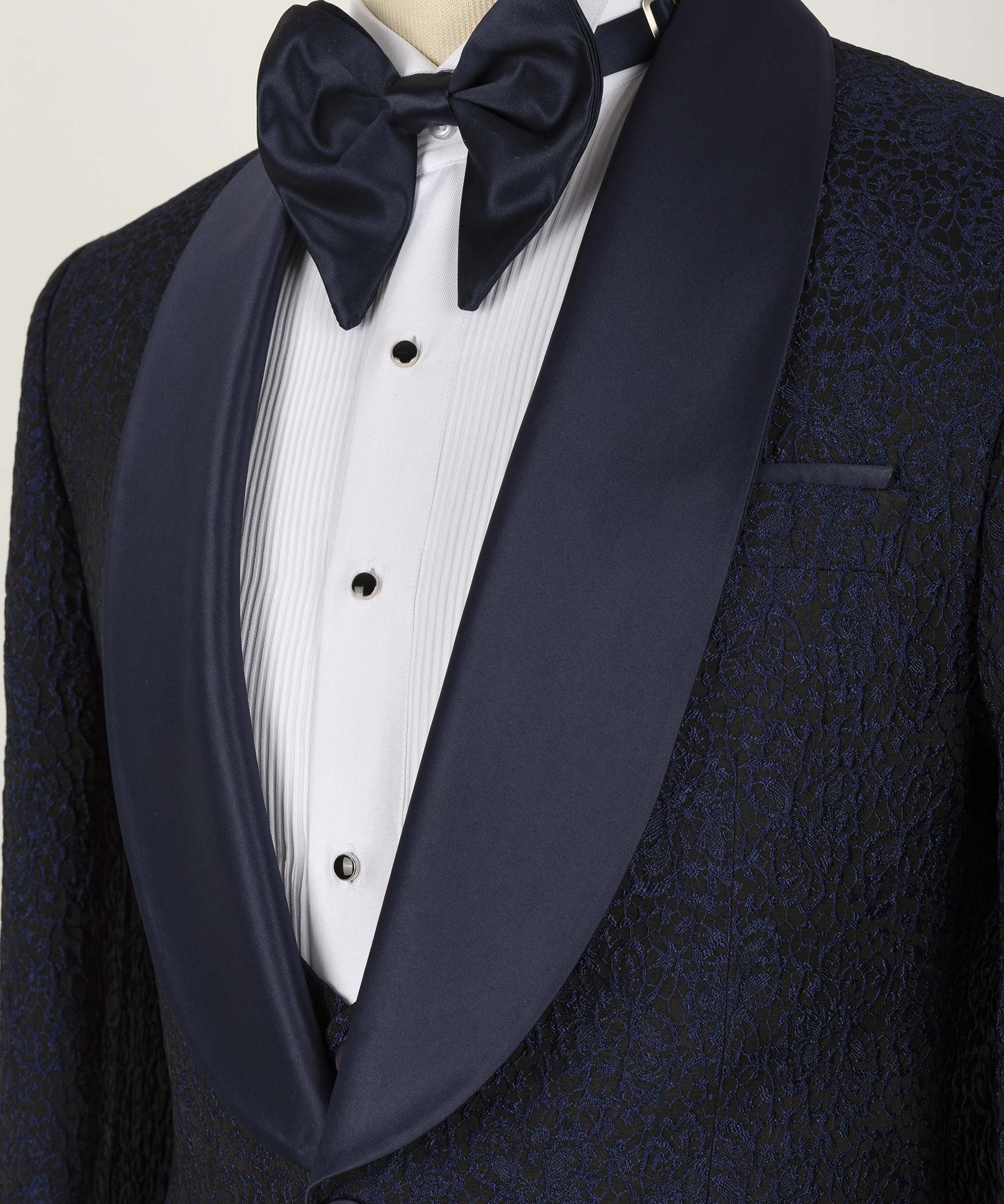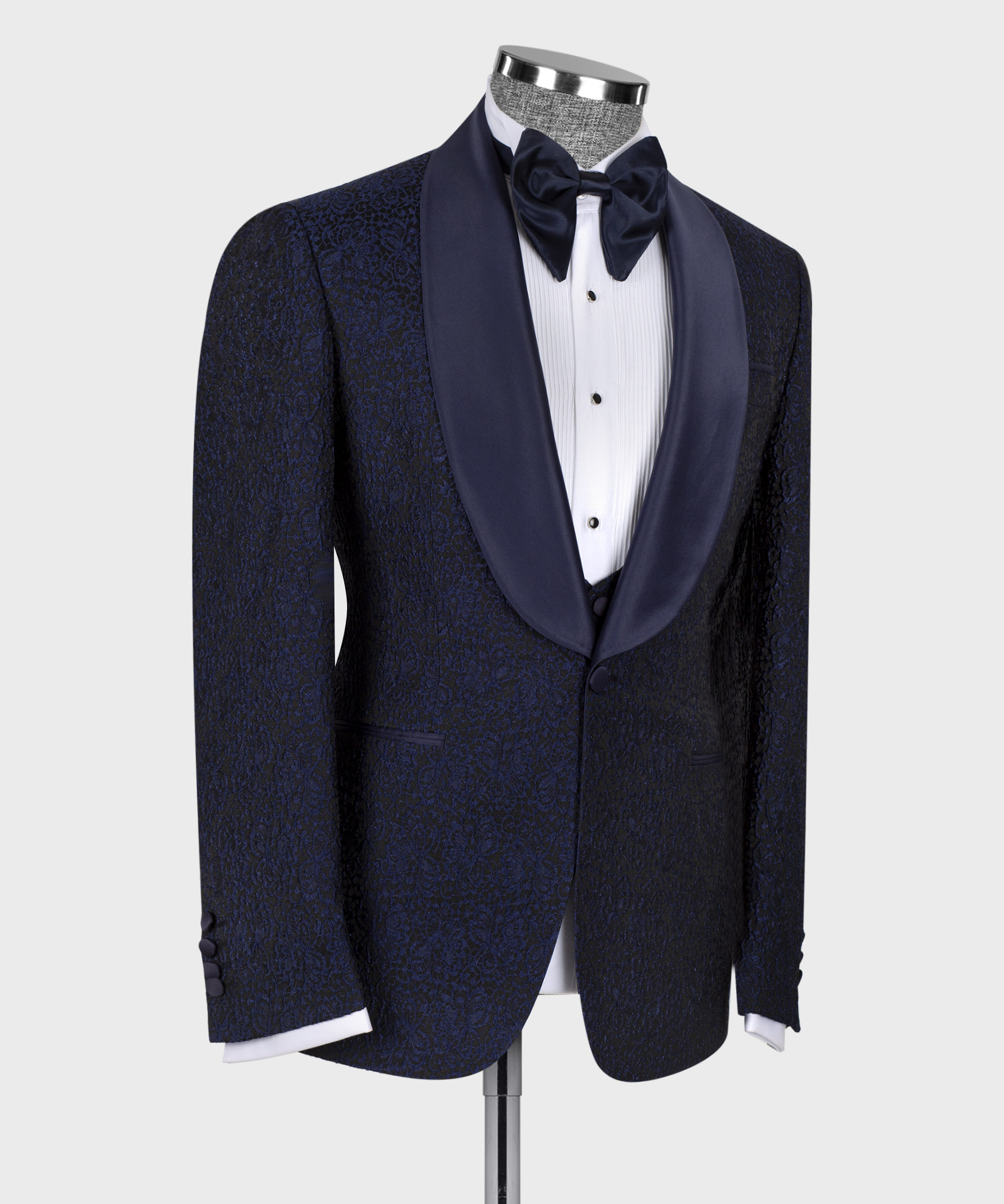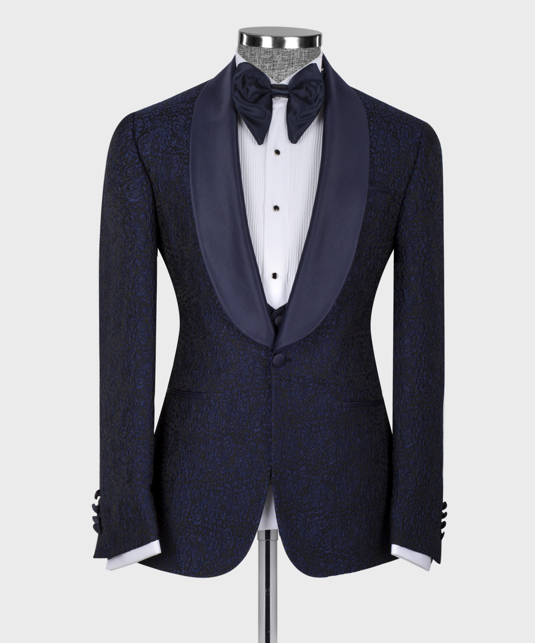 Fabric: blue jacquard fabric with satin lapel, pants colors are navy blue tuxedo pants