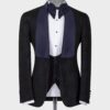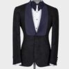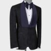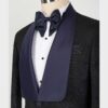 Fabric: navy blue jacquard fabric with navy blue satin lapel with black tuxedo pants