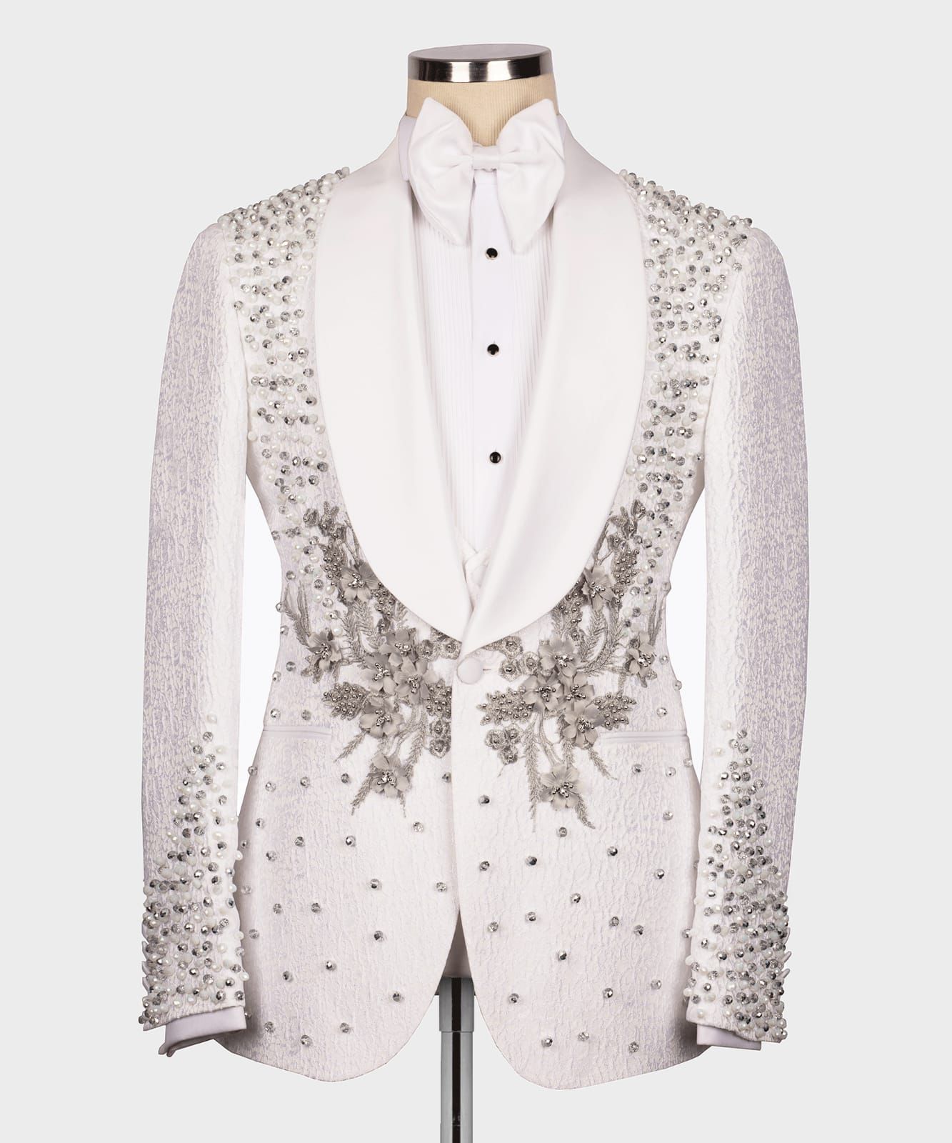 Fabric: all white jacquard with white lapel and handmade medallion.