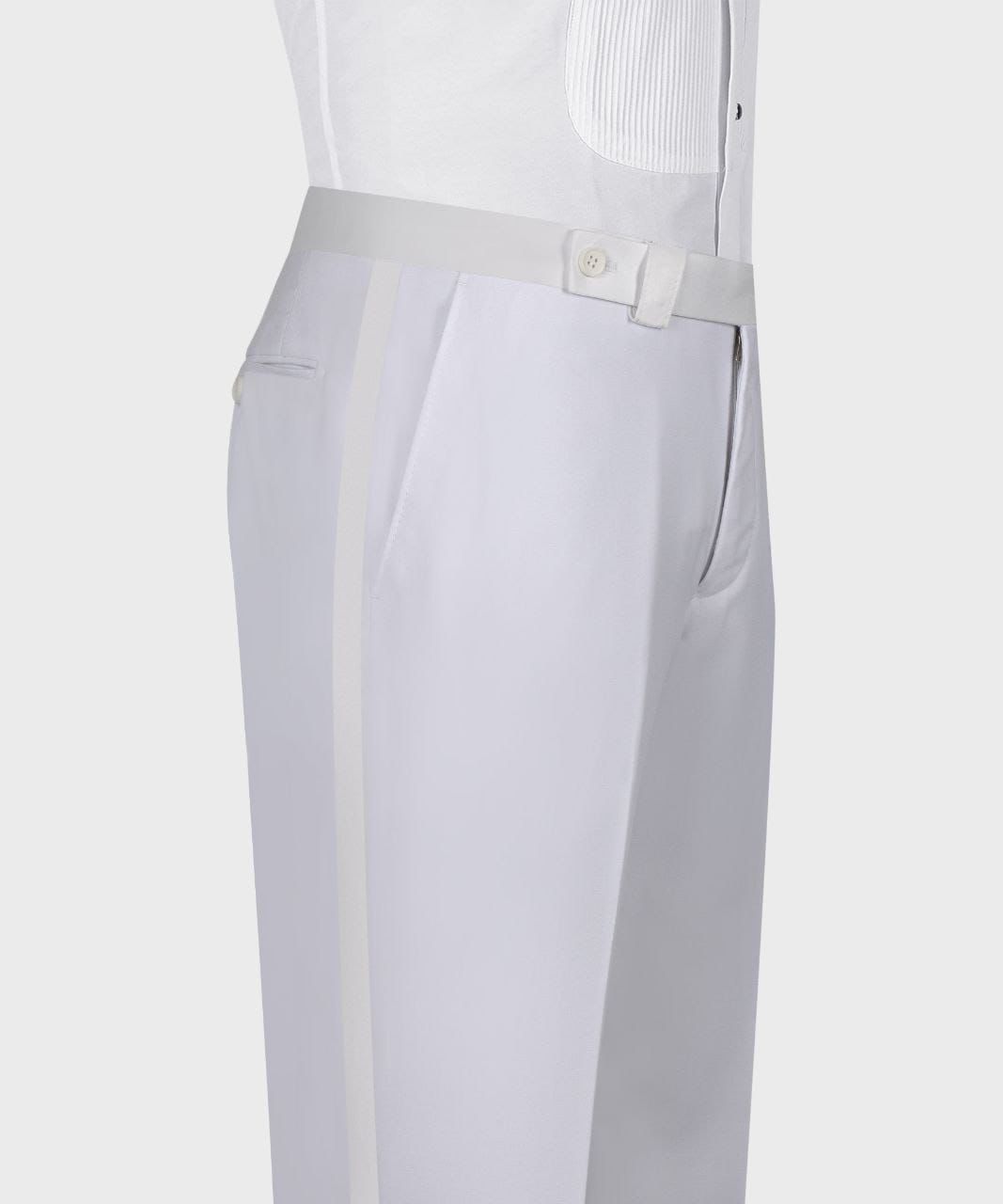 Our Liam Michael black label suits are European cut, which it tends to have slimmer-cut jacket and pants so will be cut to have a larger drop, typically a ten. In this instance, it might be worth considering going up a size to ensure the jacket isn’t too snug along with the pants. For example: Jacket size 46, pants size 40 (six drop). Customer have the option to choose black or white pants (only one pant color).
