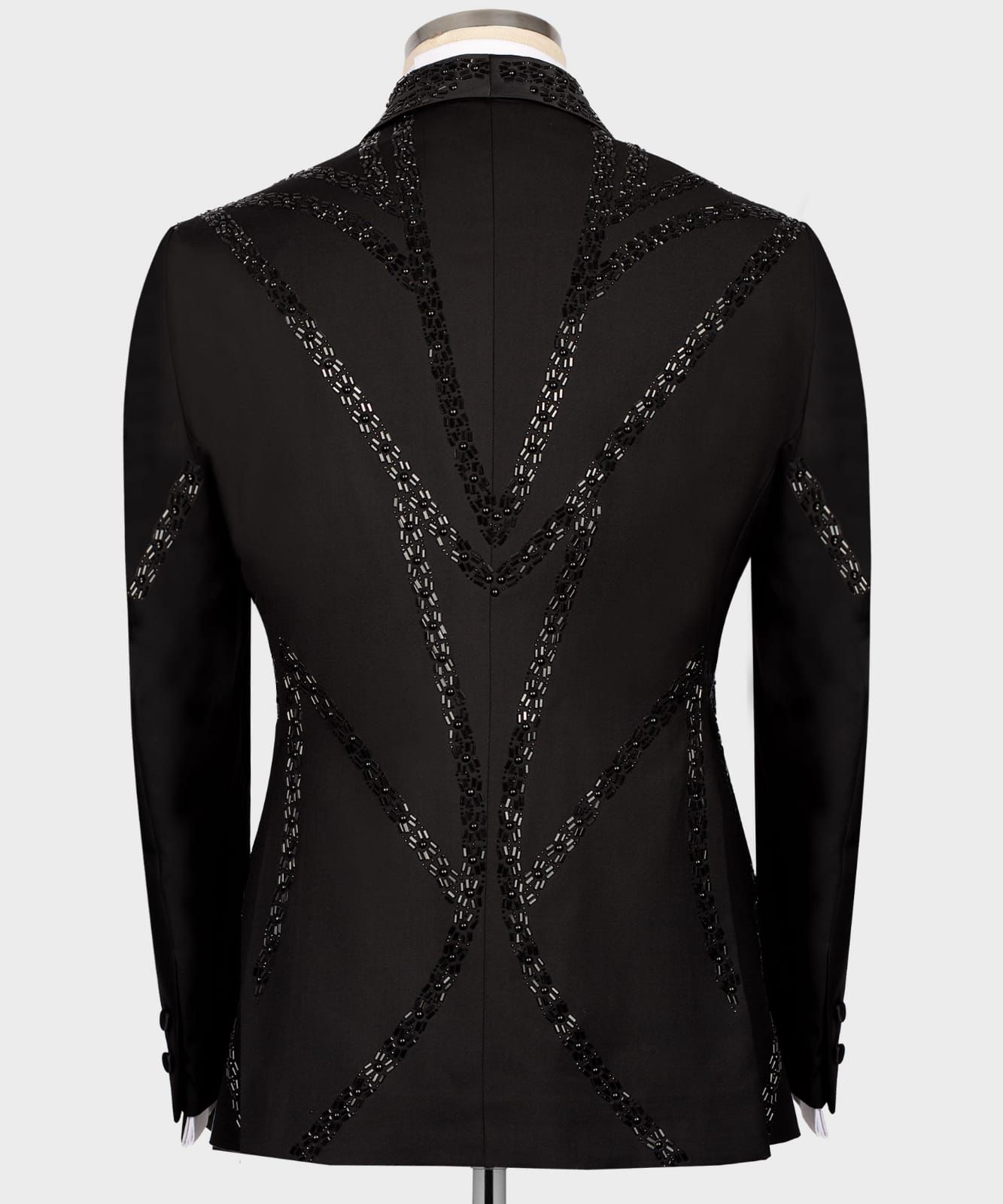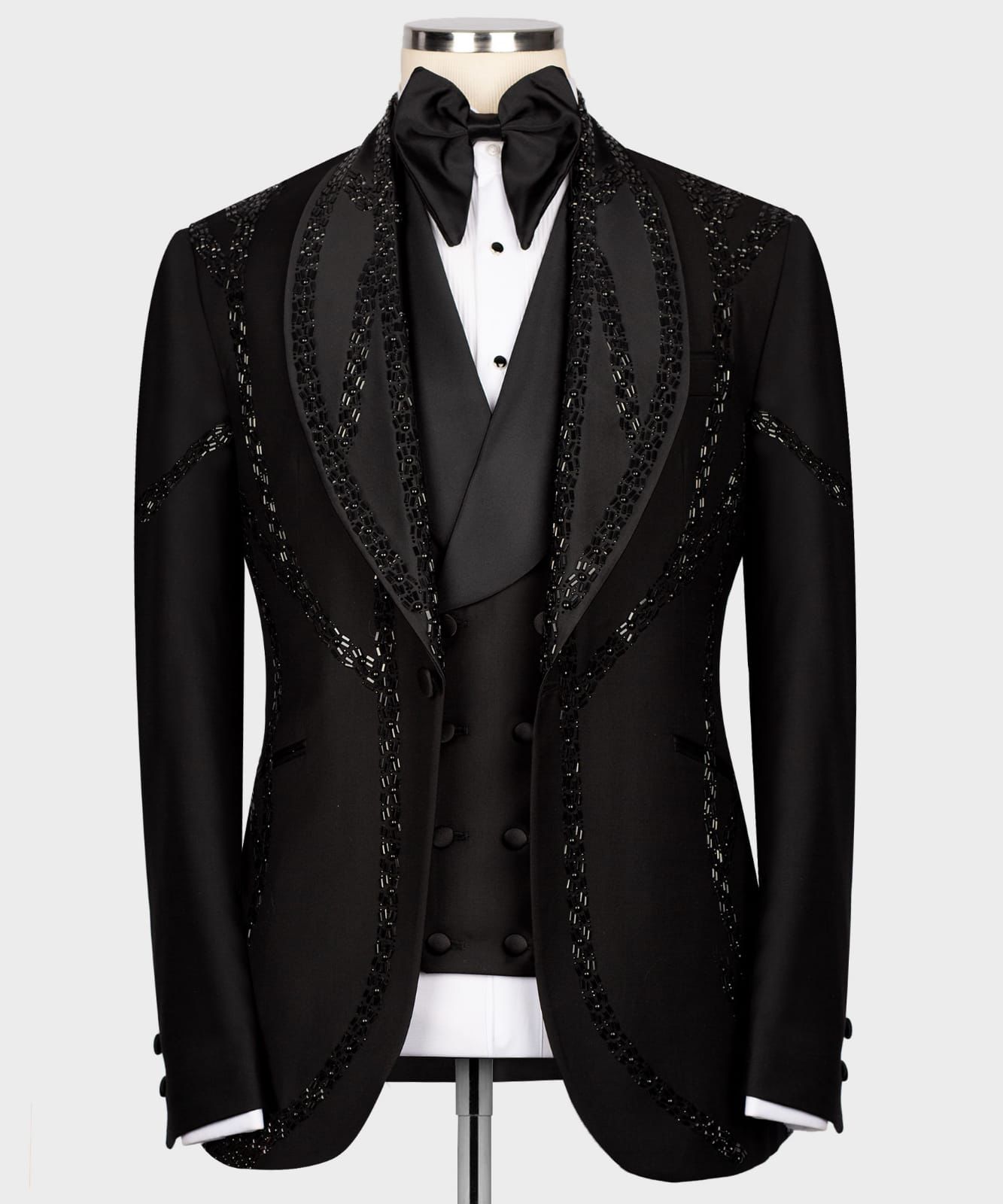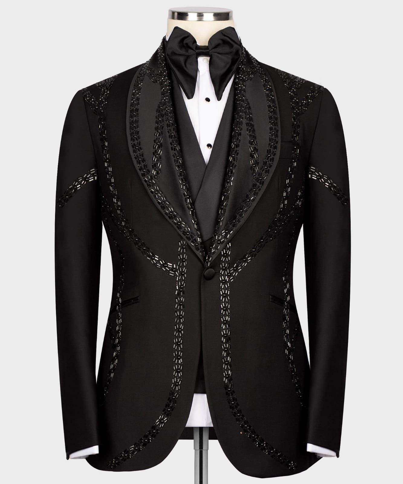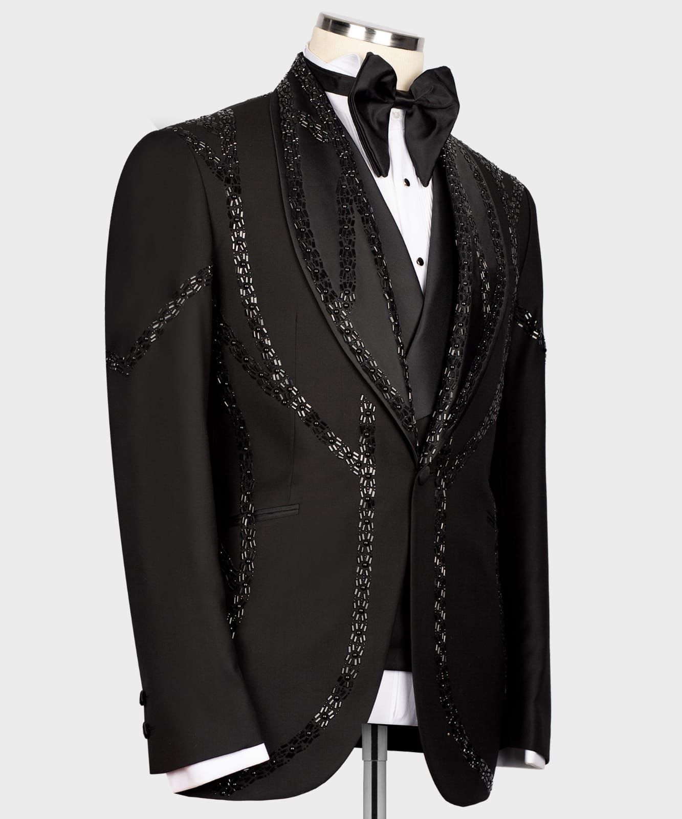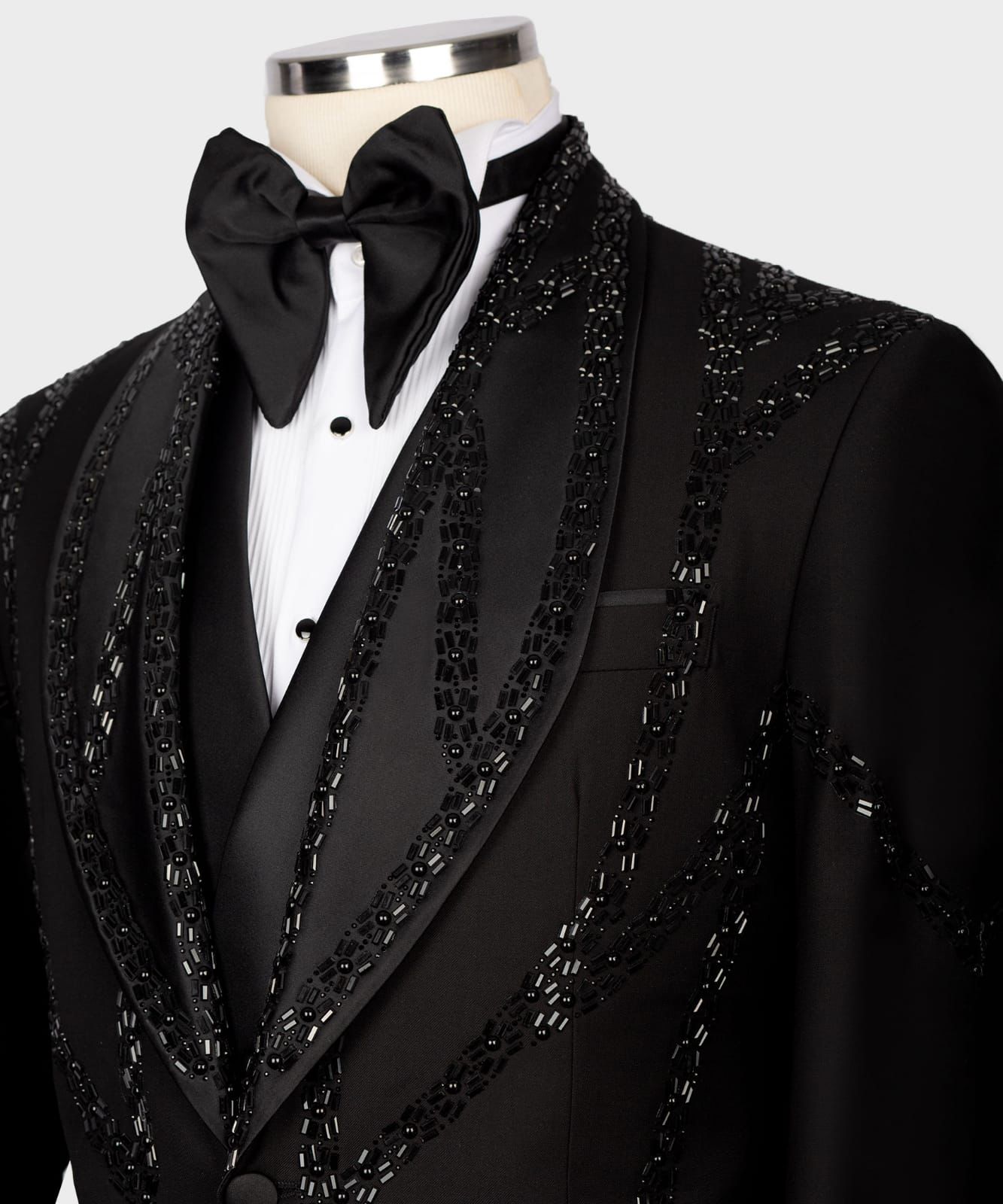 Our Liam Michael black label suits and tuxedos are European cut, which it tends to have slimmer-cut jacket and pants so will be cut to have a larger drop, typically a ten. In this instance, it might be worth considering going up a size to ensure the jacket isn’t too snug along with the pants. For example: Jacket size 46, pants size 40 (six drop). Change tuxedo pants color to white, navy for additional $125.