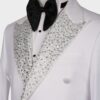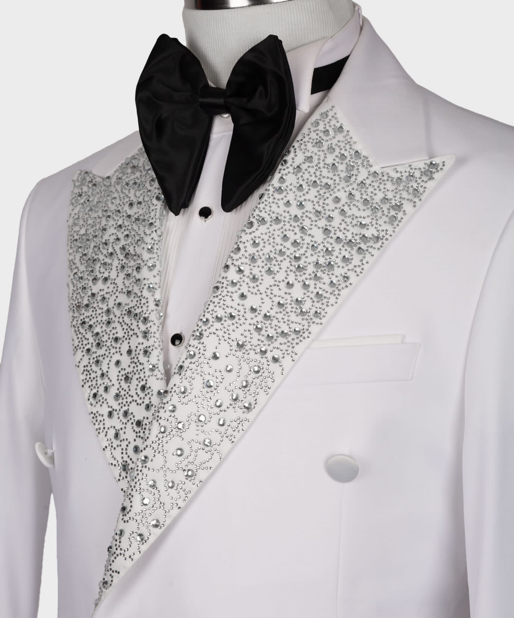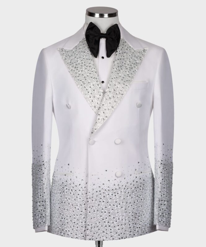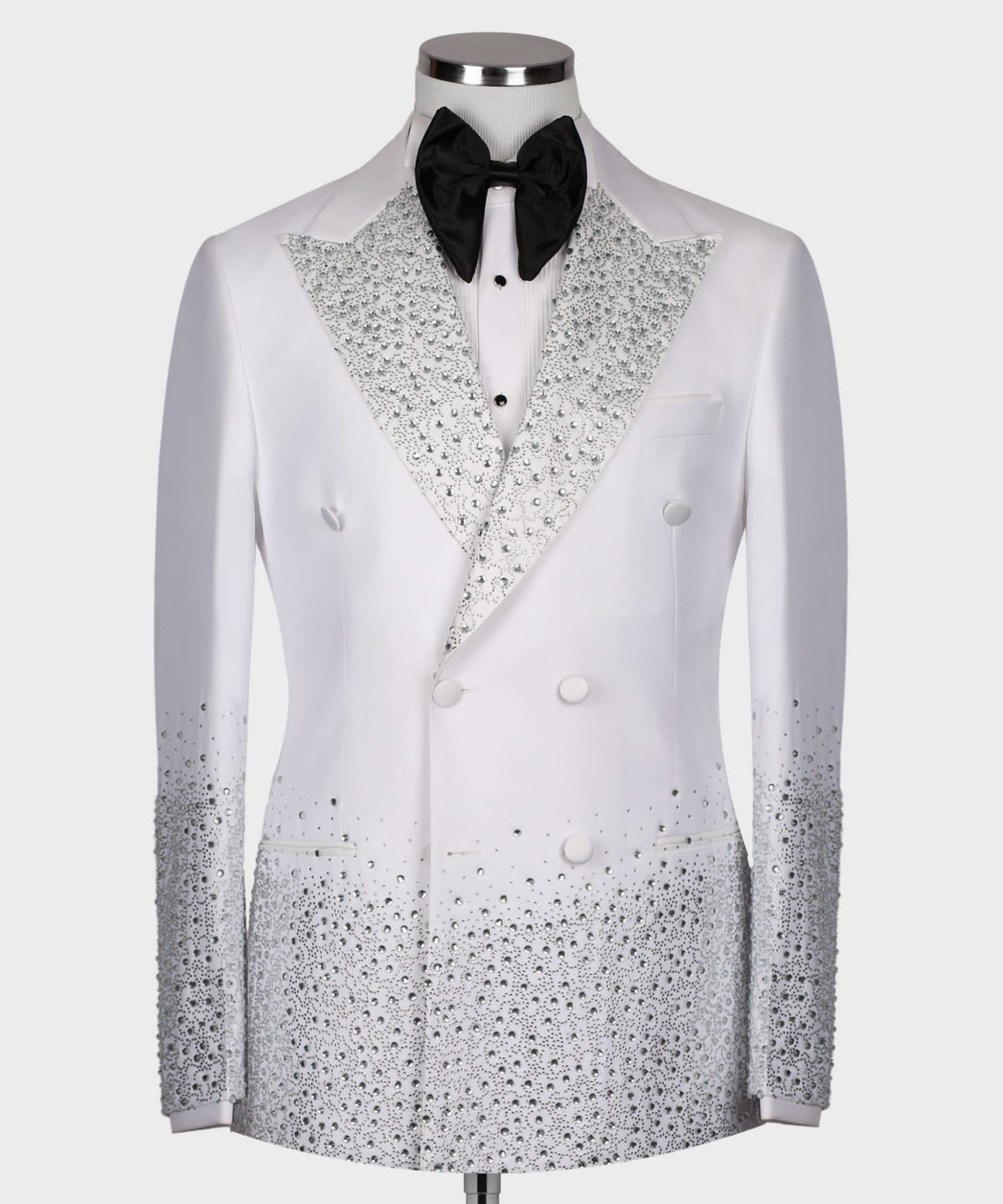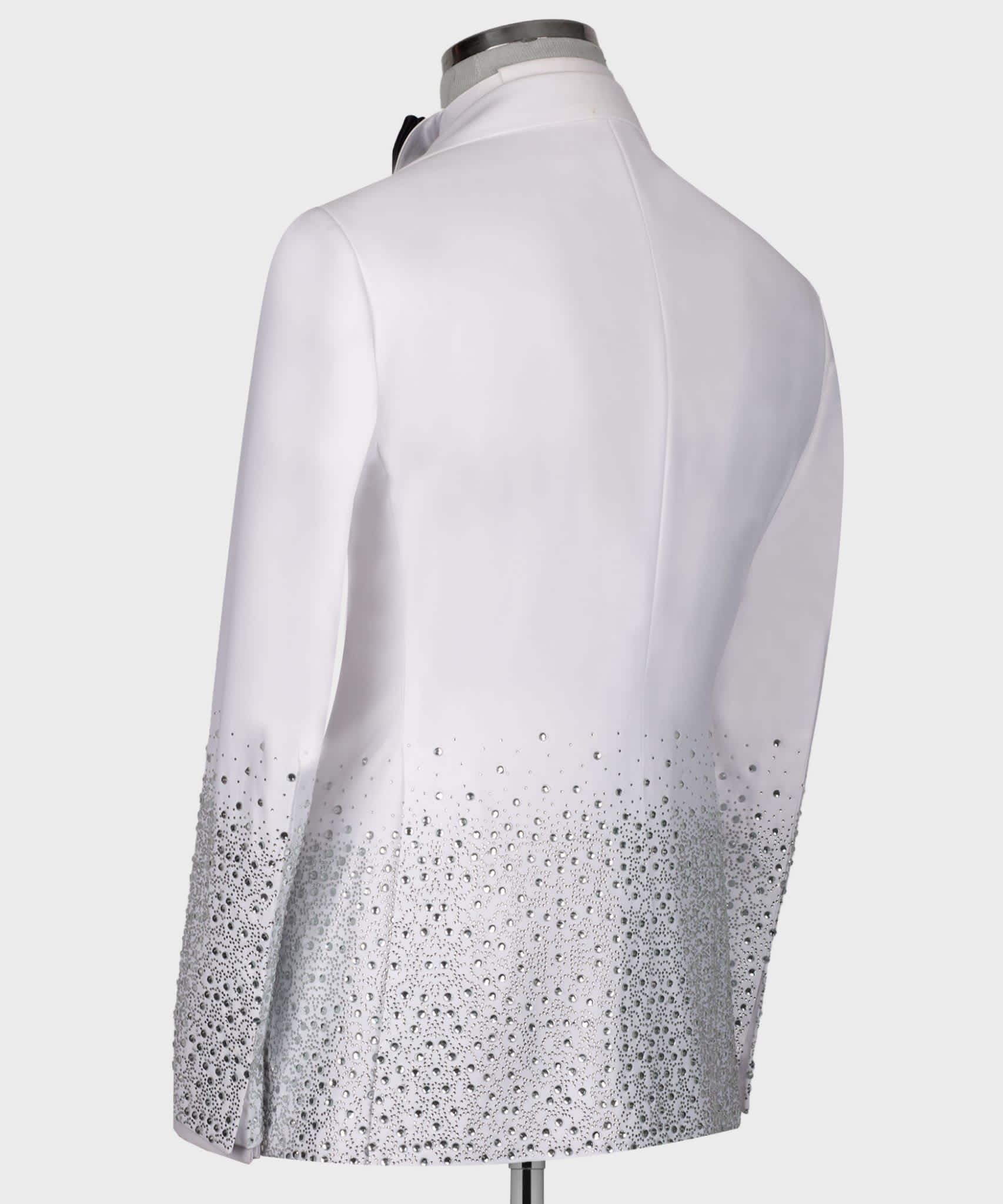 Our Liam Michael black label suits and tuxedos are European cut, which it tends to have slimmer-cut jacket and pants so will be cut to have a larger drop, typically a ten. In this instance, it might be worth considering going up a size to ensure the jacket isn’t too snug along with the pants. For example: Jacket size 46, pants size 40 (six drop). Change tuxedo pants color to white, navy for additional $125.