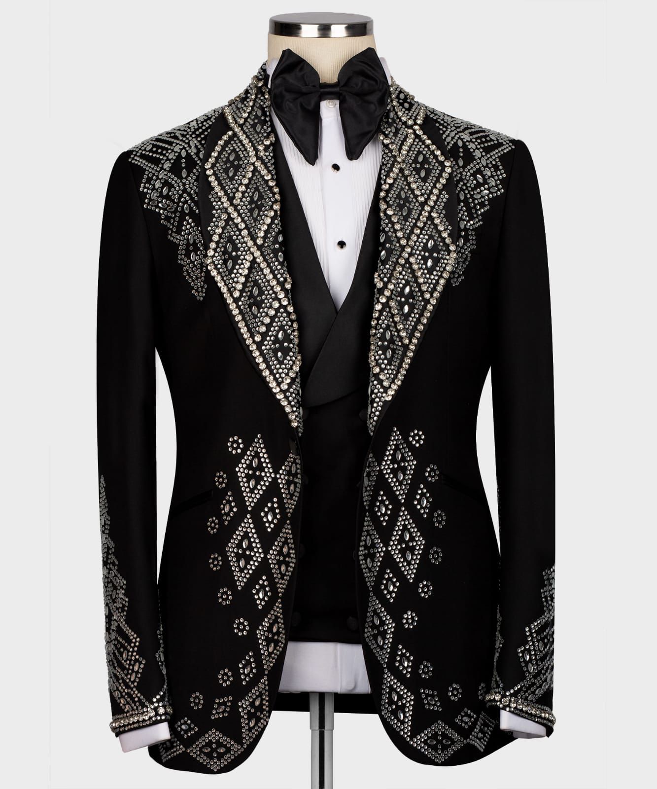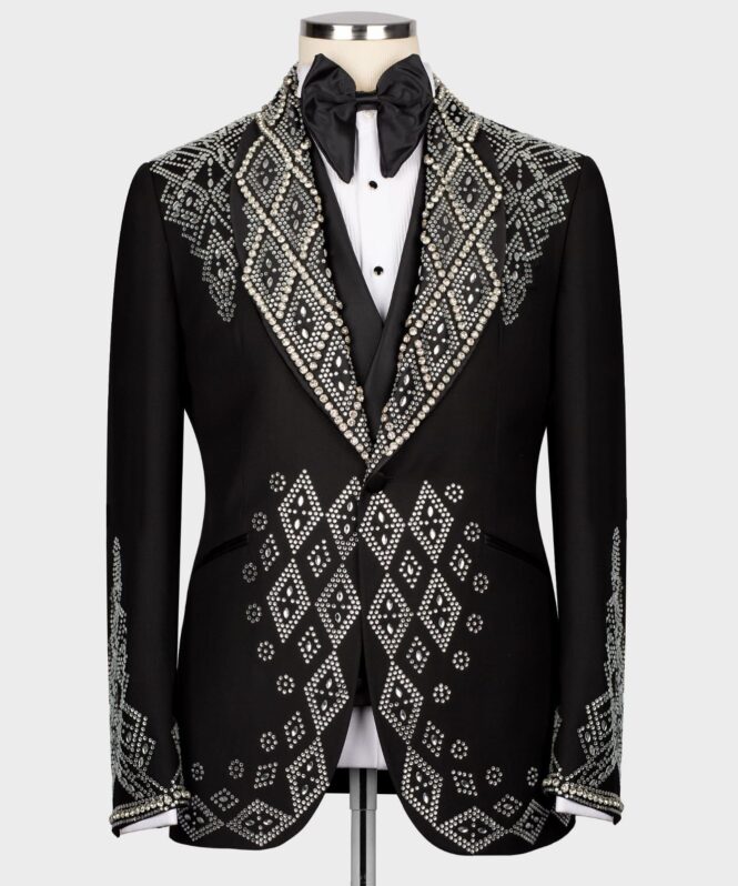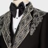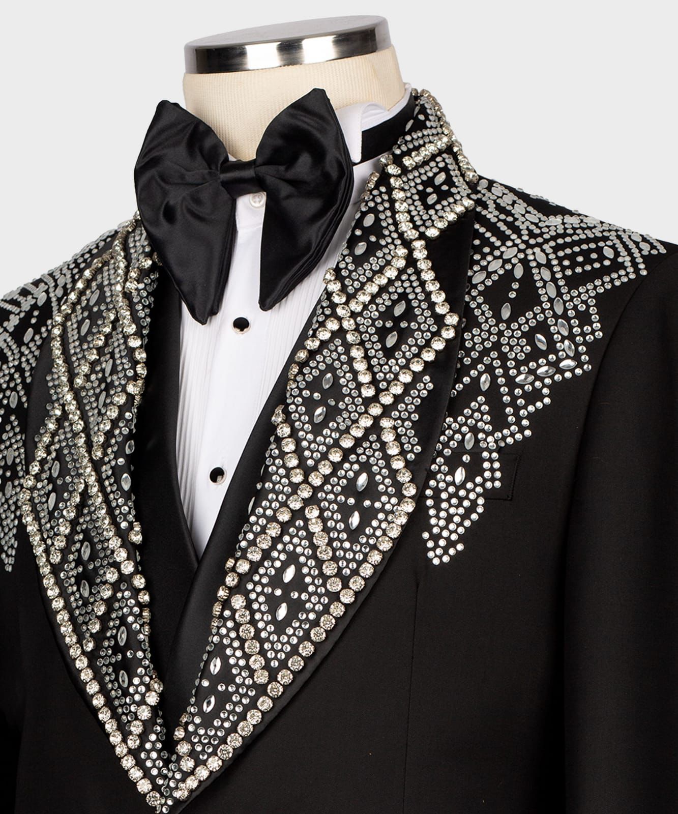 Our Liam Michael black label suits and tuxedos are European cut, which it tends to have slimmer-cut jacket and pants so will be cut to have a larger drop, typically a ten. In this instance, it might be worth considering going up a size to ensure the jacket isn’t too snug along with the pants. For example: Jacket size 46, pants size 40 (six drop). Change tuxedo pants color to white, navy for additional $125.