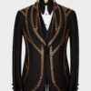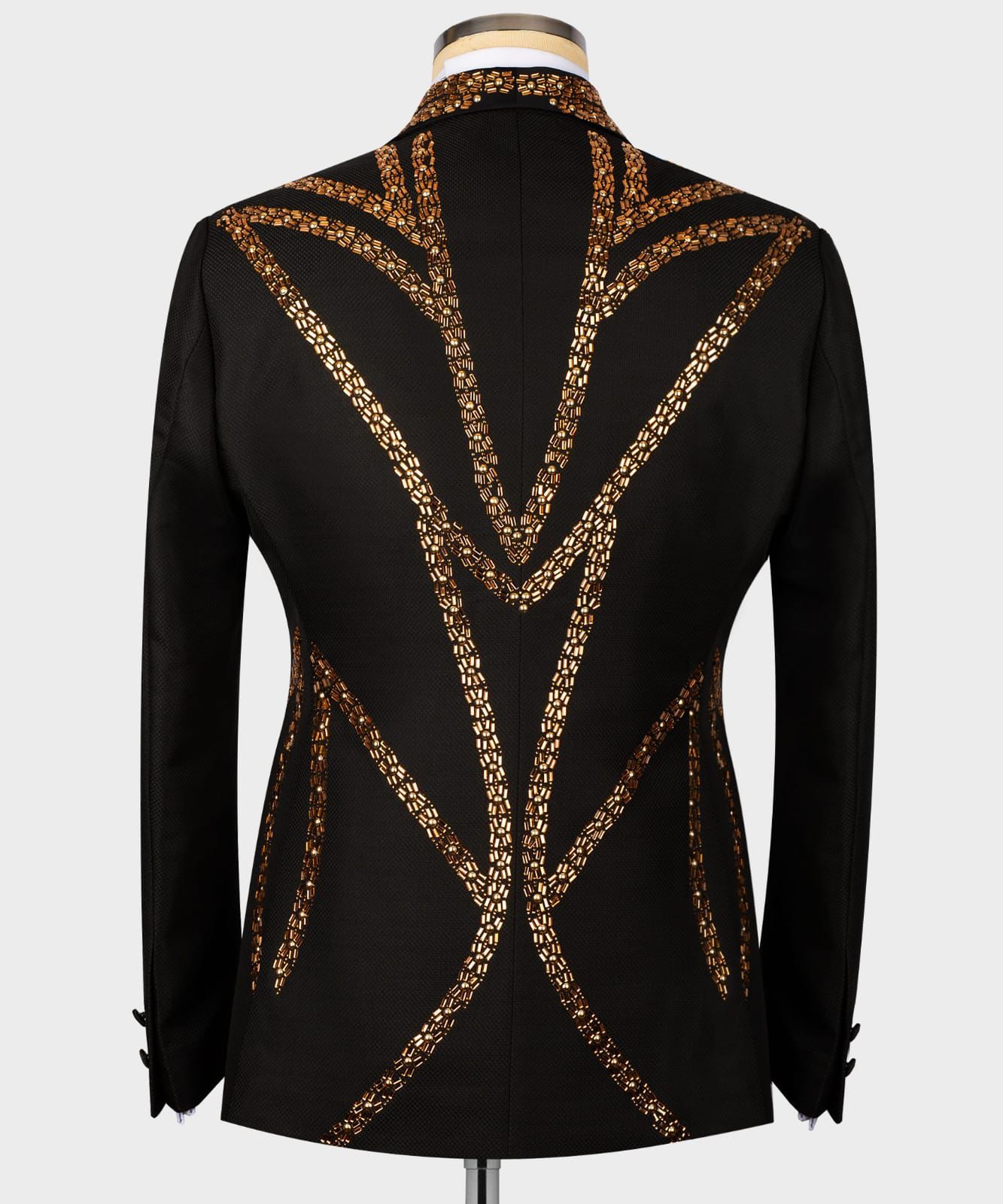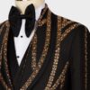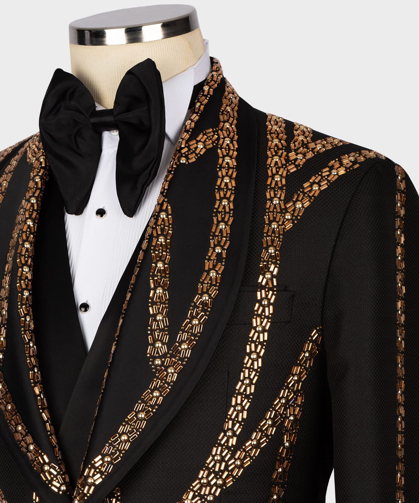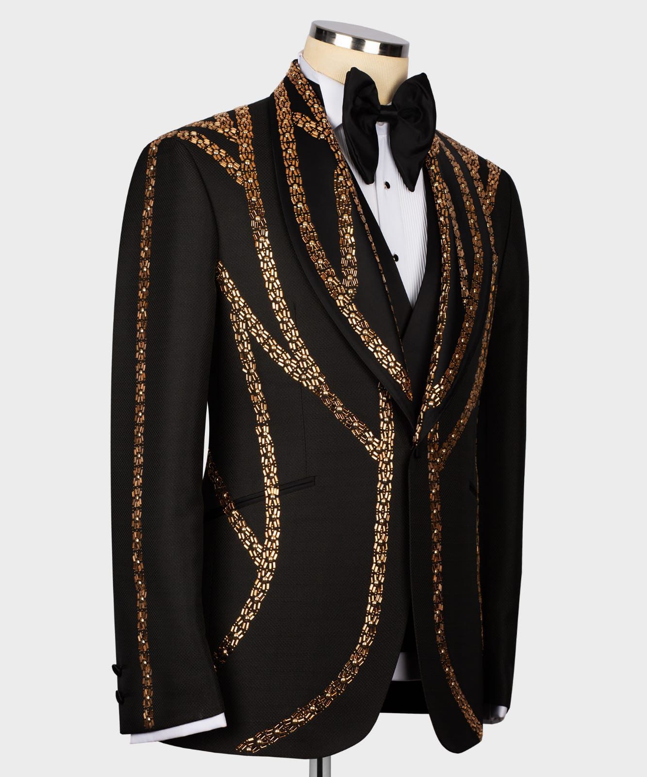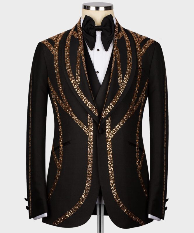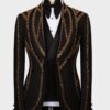 Our Liam Michael black label suits and tuxedos are European cut, which it tends to have slimmer-cut jacket and pants so will be cut to have a larger drop, typically a ten. In this instance, it might be worth considering going up a size to ensure the jacket isn’t too snug along with the pants. For example: Jacket size 46, pants size 40 (six drop). Change tuxedo pants color to white, navy for additional $125.