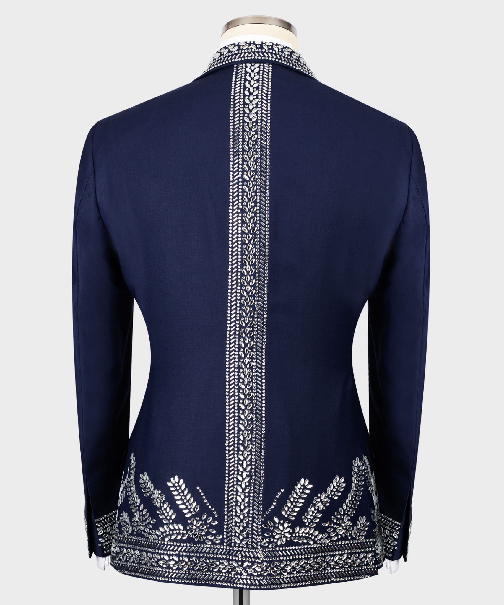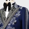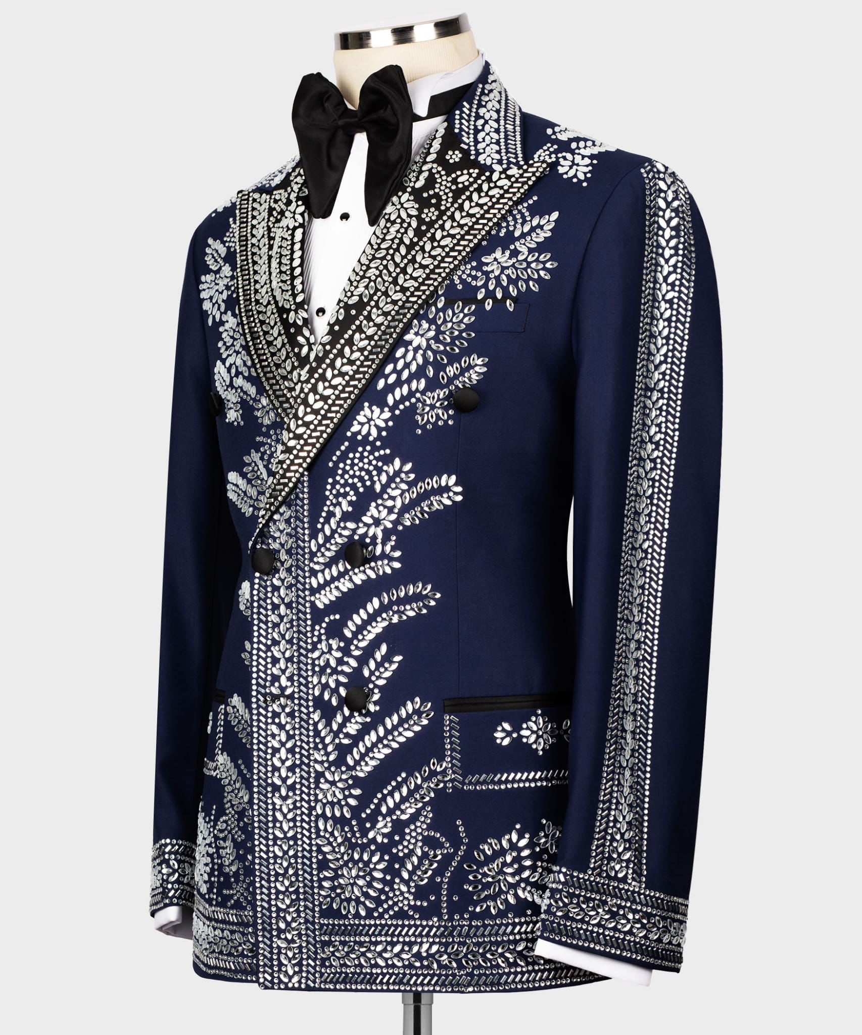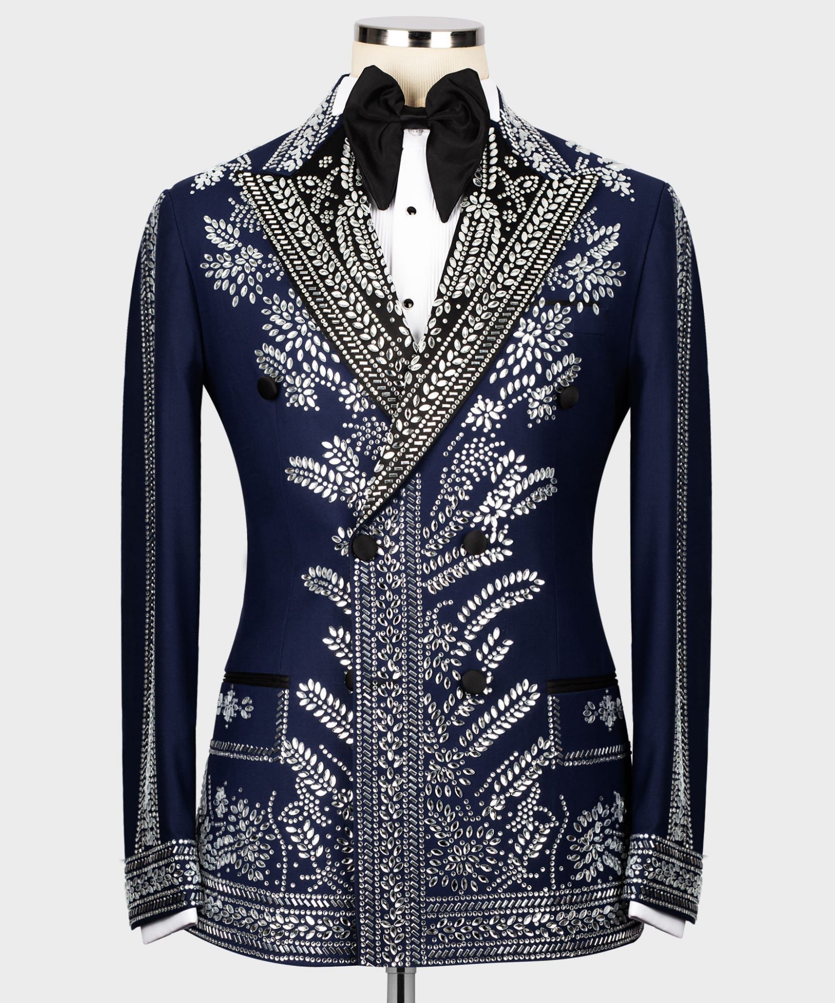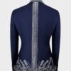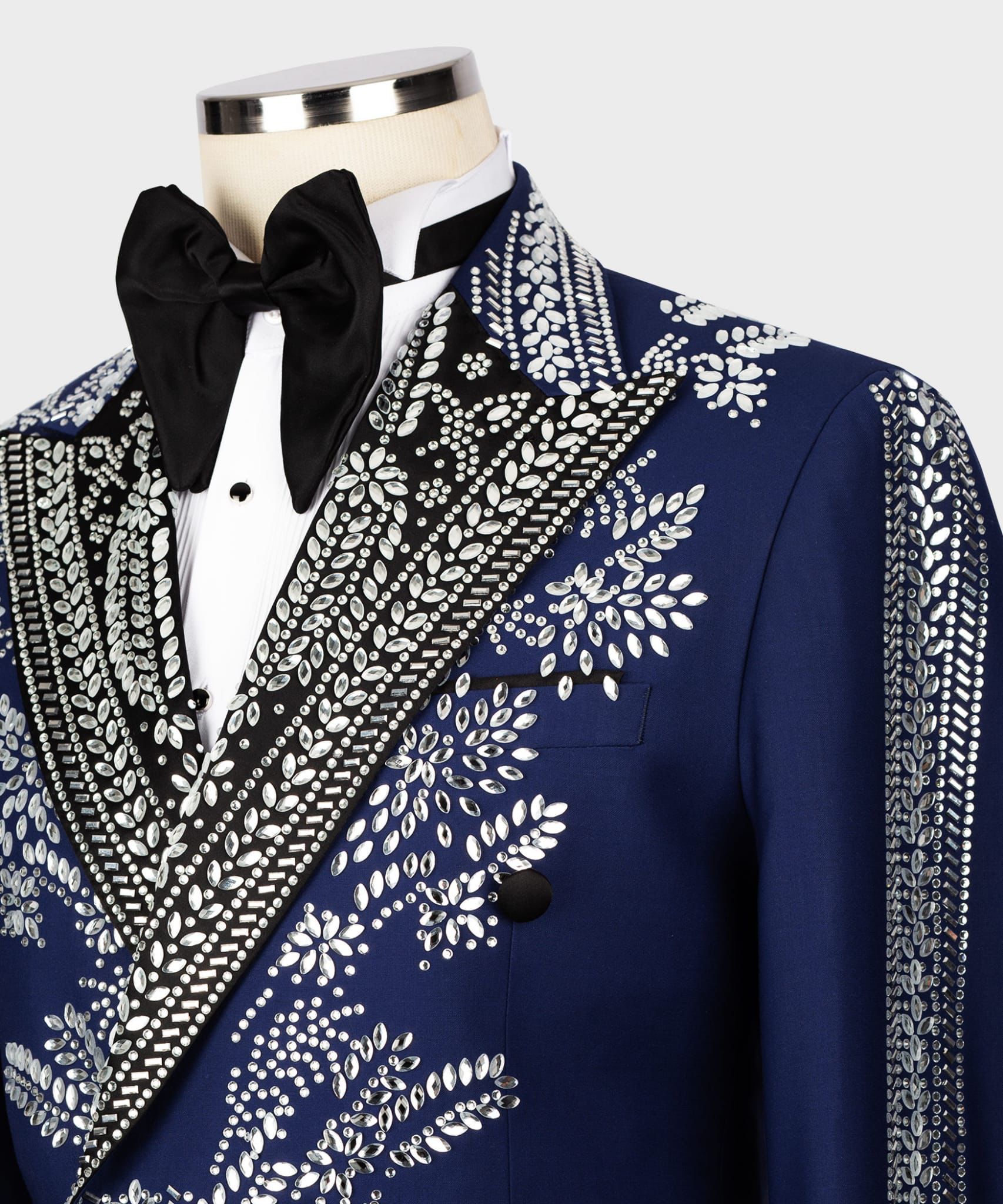 Our Liam Michael black label suits and tuxedos are European cut, which it tends to have slimmer-cut jacket and pants so will be cut to have a larger drop, typically a ten. In this instance, it might be worth considering going up a size to ensure the jacket isn’t too snug along with the pants. For example: Jacket size 46, pants size 40 (six drop). Change tuxedo pants color to white, navy for additional $125.
